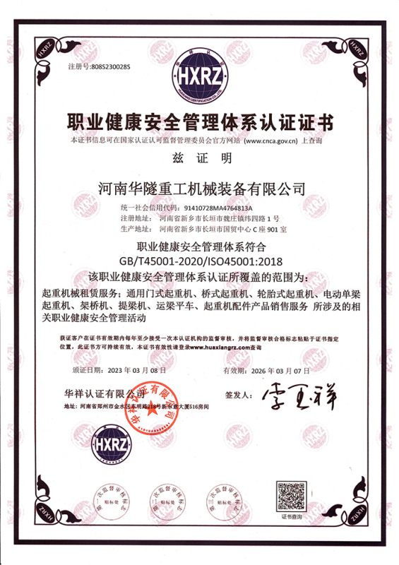 河南華隧重工機械裝備有限公司主要從事通用門式起重機、橋式起重機、電動單梁起重機,輪胎式起重機、架橋機、提梁機、遠梁平車、鋼絲繩電動萌蘆、卷揚機、起重配件制造、銷售:起重機械租賃、安裝和維修,起重設備園收,機械設備維修,鋼結構工程承包,橋梁工程及技術咨淘服務,銷售五金制品、機電設備:建設工程監理,建設工程設計,各類工程建設活動,建筑勞務分包,建筑物折除作業,施工作業,工程管理服務,土石方工程施工,裝如發運。  公司已通過IS0國際質量、環境、健康與安全三合一標準認證,特種設備制造許可證和特種設備安裝改造維修許可證。擁有完熟的質量管理體系。嚴格的管理制度,強大的生產能力和先進的檢測手段,在保證產品質量的同時,也具備了極強的市場競爭力。  公司堅持科技創新為理念,產品質量為核心,注重信譽,建立了減信可靠、快捷、思速。便利周到的售后服務網絡?! ∥覀儞碛械募夹g專家和技術服務隊伍為客戶提供充善的售前技術支持和全天候的售后服務體系,讓您無后顧之憂,享受一站式的超值服務?!  叭A隧重工,伴您成功“是華隧重工永遠的宗指,真被的希望與各界朋友攜手并進。共創輝準!